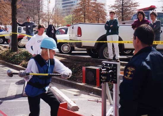 With encouragement from the sidelines, a candidate tries out the Candidate Physical Ability Test course that was set up on Saturday outside the hotel.